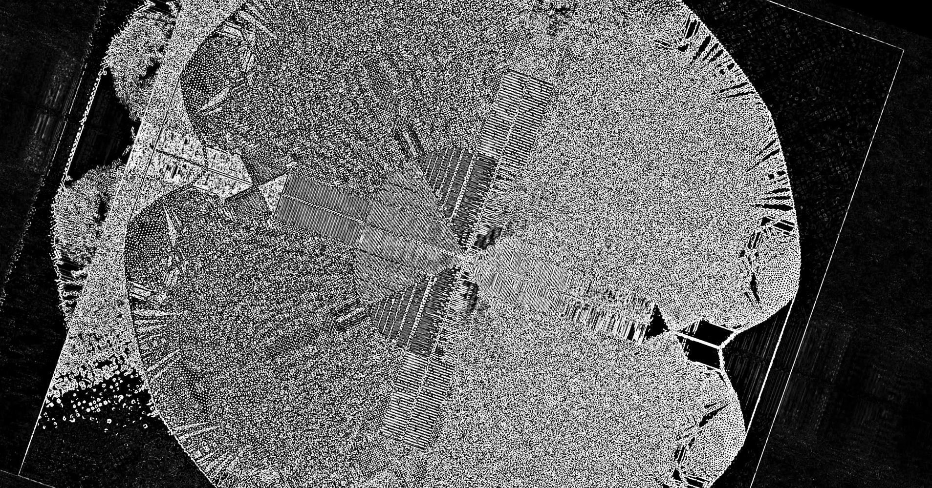Cette image est issue d'une performance vidéo en temps réel. À l'origine, il s'agit de visuels issus d'un automate cellulaire simulant l'écoulement de grains de sable sur un plan.